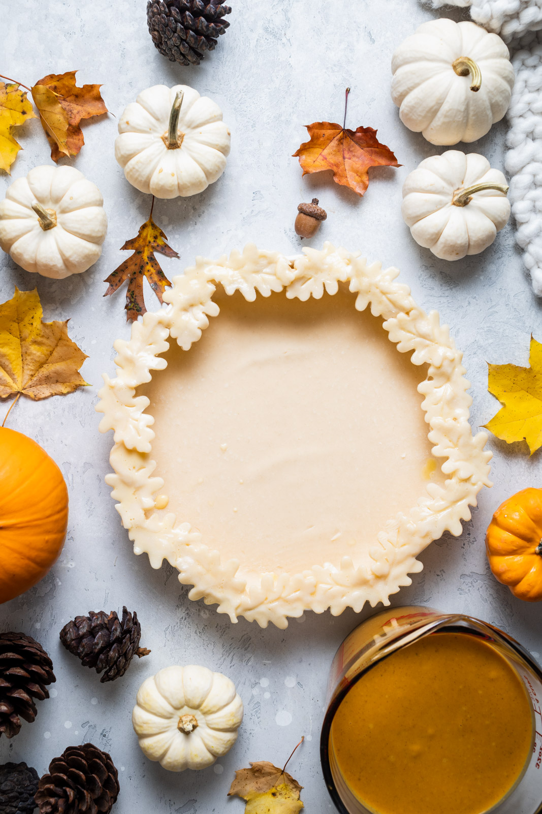 - Prepare filling: In a food processor, pulse the pumpkin with spices and lemon juice, followed by the brown butter caramel, eggs, milk, maple syrup, molasses and carrot juice. Feel free to whisk these ingredints in a bowl until smooth if you don’t want to use a food processor