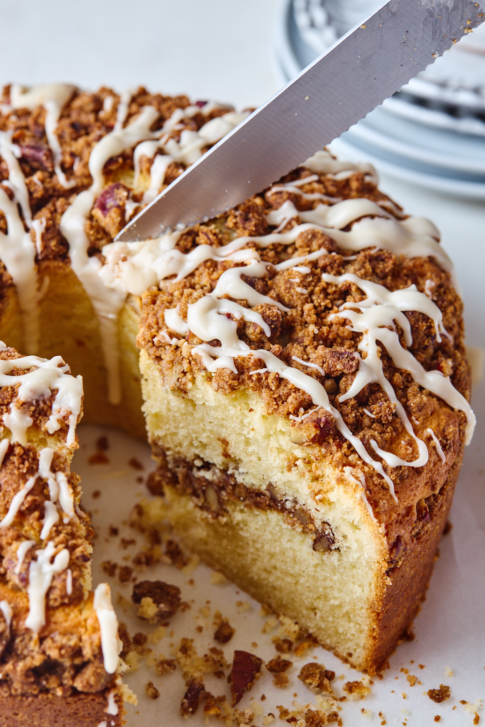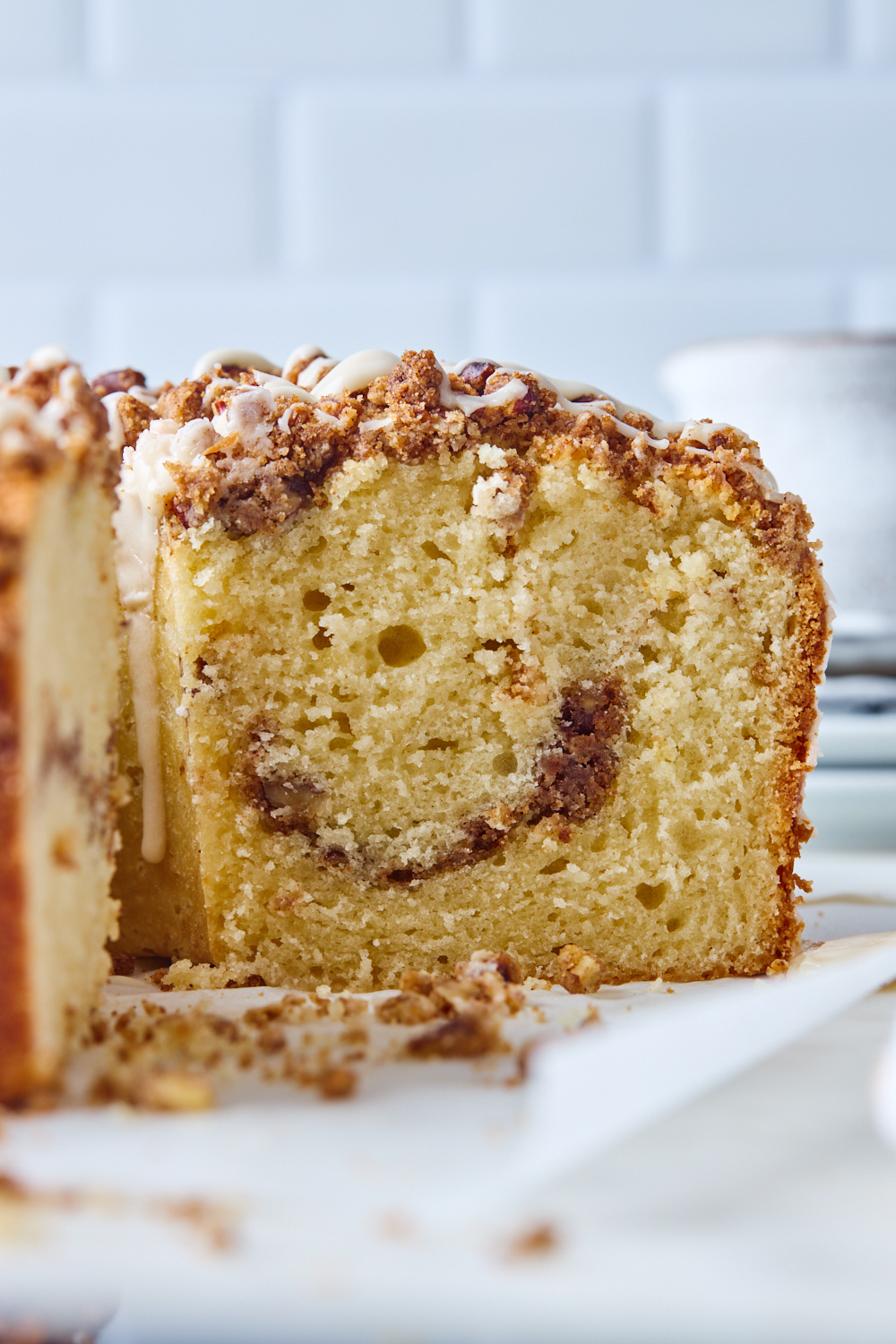 You can freeze this cake! Freeze the entire coffee cake before serving by allowing it to come to room temperature, then wrapping tightly and storing in the freezer. (Don’t forget to label well!). It will last up to 6 months in the freezer. You can also freeze leftover slices for a quick snack later. Again, wrap tightly and label well.To thaw an individual slice, place in the microwave for up to 30 seconds. To thaw a loaf, leave out at room temperature overnight. If freezing cake ahead of time, it is best to add icing or glaze right before serving rather than before freezing.