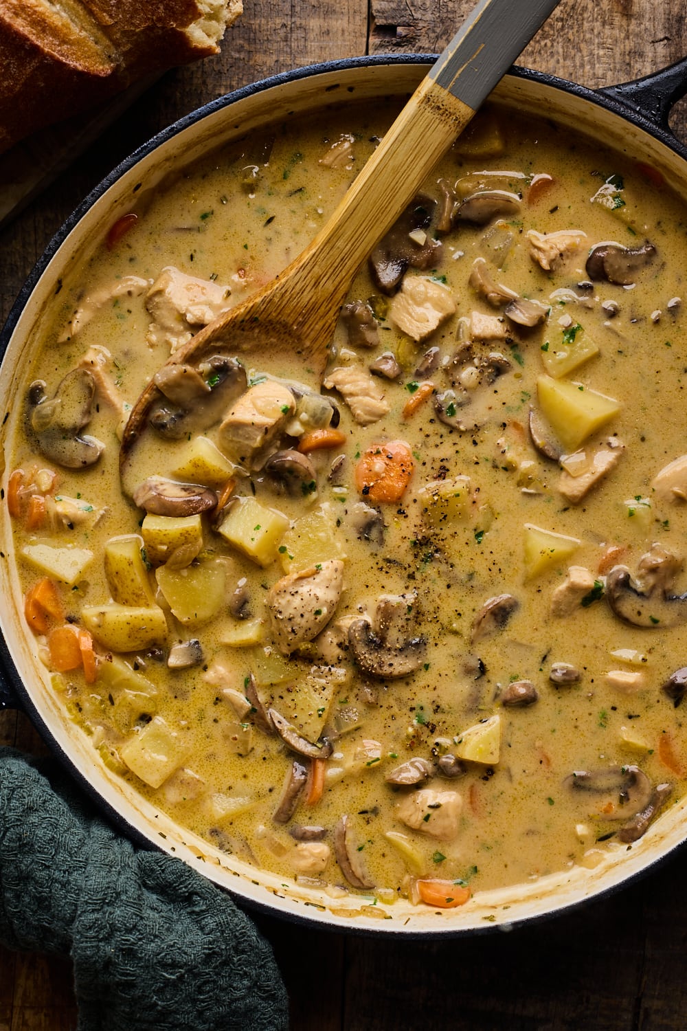 This easy to make chicken stew is full of tender pieces of chicken and loads of vegetables in a very flavorful creamy sauce creating a very comforting hearty stew. Similar to a classic beef stew but with chicken (cooks way faster than a beef stew), with the same kind of comfort as chicken soups but with a richer thicker creamy sauce. Tastes like comfort in a bowl - warm hearty and delicious - perfect for a cold day!