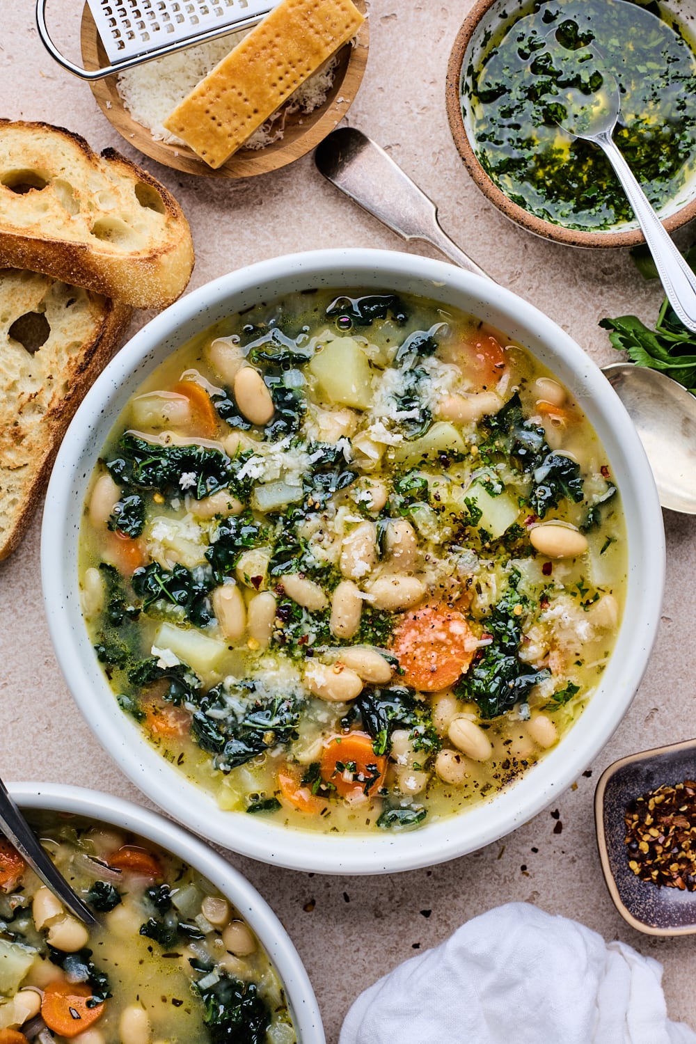 - Serve Soup: Ladle soup into bowl. Drizzle with sauce if using. Serve with grated parmesan cheese, chili flakes, lemon wedges and crusty for dipping