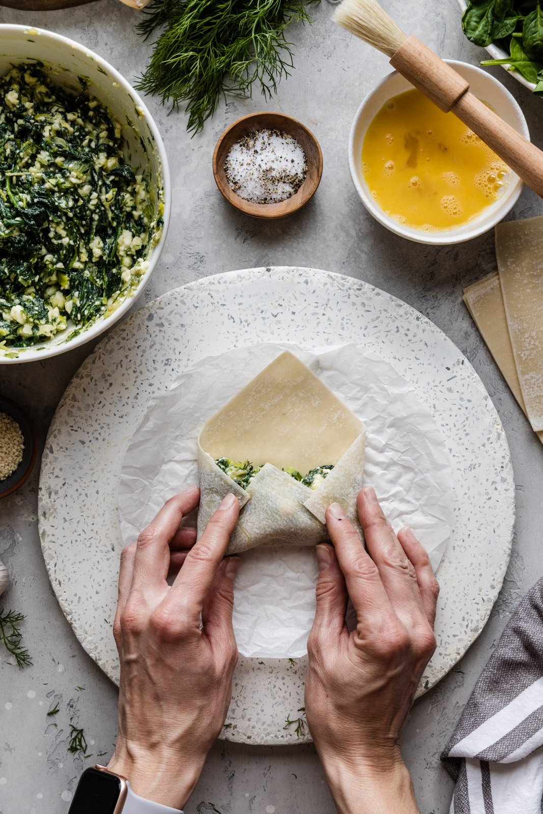 Heat the oven to 400°F and line a sheet pan with parchment paper and set aside. Heat the olive oil in a frying pan at Medium heat and cook the leeks, garlic and spinach for 8-10 minutes until spinach is cooked down and most of the moisture from it has cooked off. (If there is still a lot of moisture in the spinach feel free to squeeze some out of it with a paper towel as soon as it’s cool enough to handle) Remove from heat and place in a medium size bowl and allow to cool slightly. Add the feta, egg, dill, nutmeg and lemon zest, salt and pepper and mix really well.
