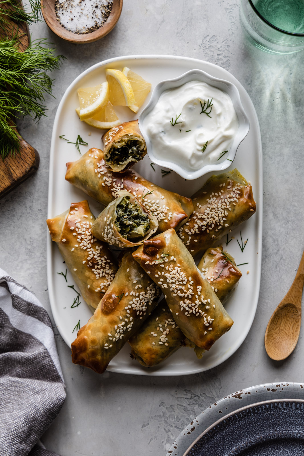 These are addictive, they have that extra special crunch that spring rolls do with a very delicious creamy spinach leek and feta filling. When my mom makes pita with her homemade phyllo recipe I always go for the corner pieces - the crunchiest ones. I know I’m not alone - we all love those buttery crispy edges. Well each bite of these rolls is like that corner piece - irresistibly good.