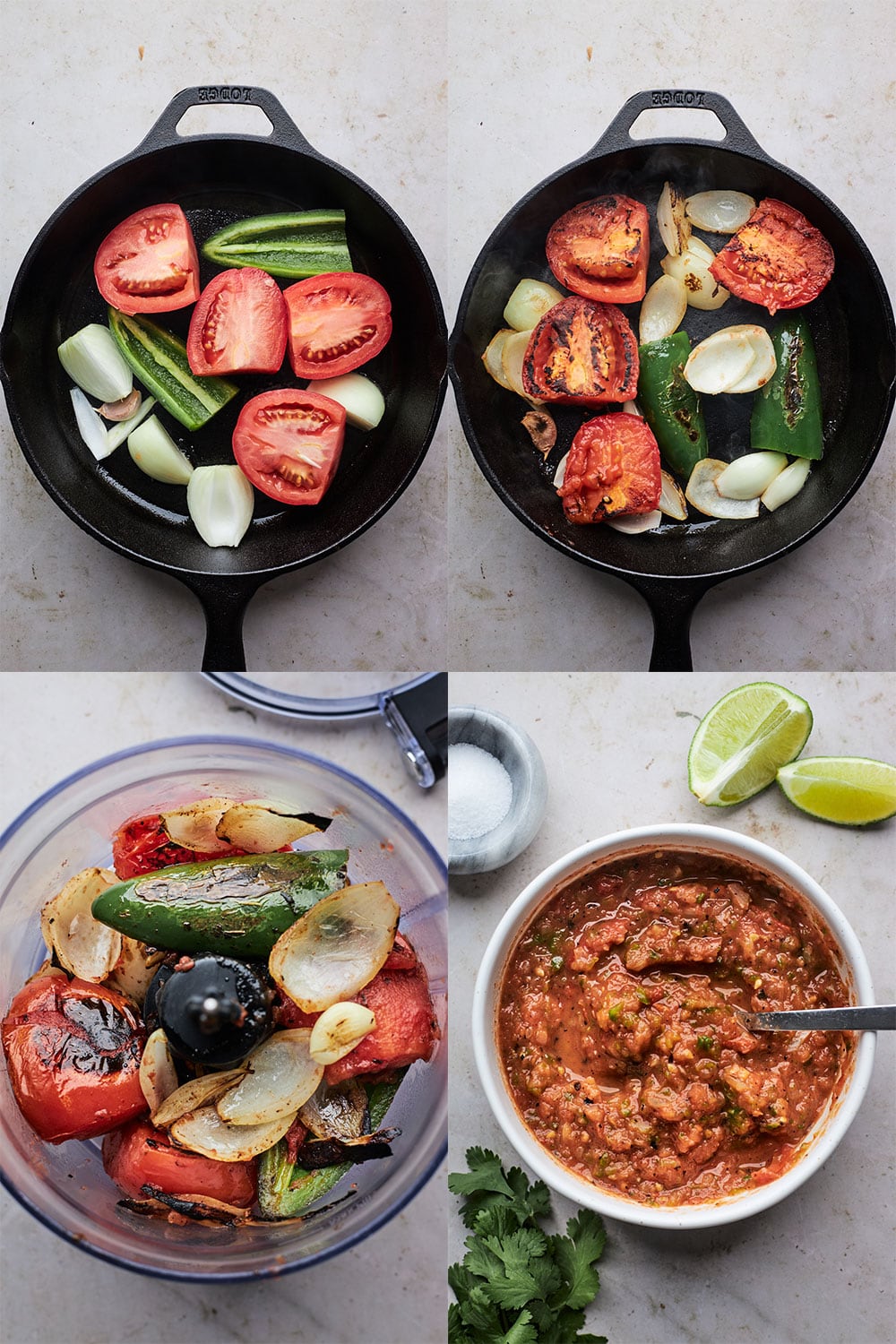 - Heat a large skillet (I used a cast-iron) over medium-high heat and add 1 tablesoon oil. Cook the tomatoes, onion, jalapeños, and unpeeled garlic, using tongs to flip them often, until charred all over, for approx 5-8 minutes. If the garlic and jalapeño are charring too quickly, remove from pan and allow the other ingredients to continue to char a a little longer. (See recipe note for oven version and boiled version)