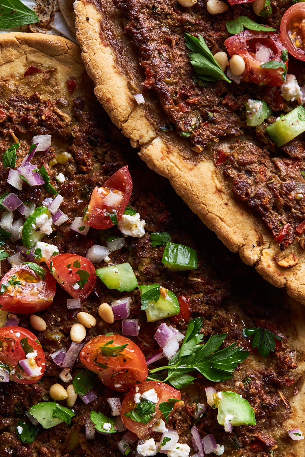 - The Topping: The lahmacun is traditionally served with lemon wedges and a mixture of Italian parsley, sliced red onion, and a sprinkling of sumac. I like mine loaded with a lemony chopped salad - but you can either pile it on or have it on the side. I also added crumbled feta because the Greek in me just couldn’t resist.