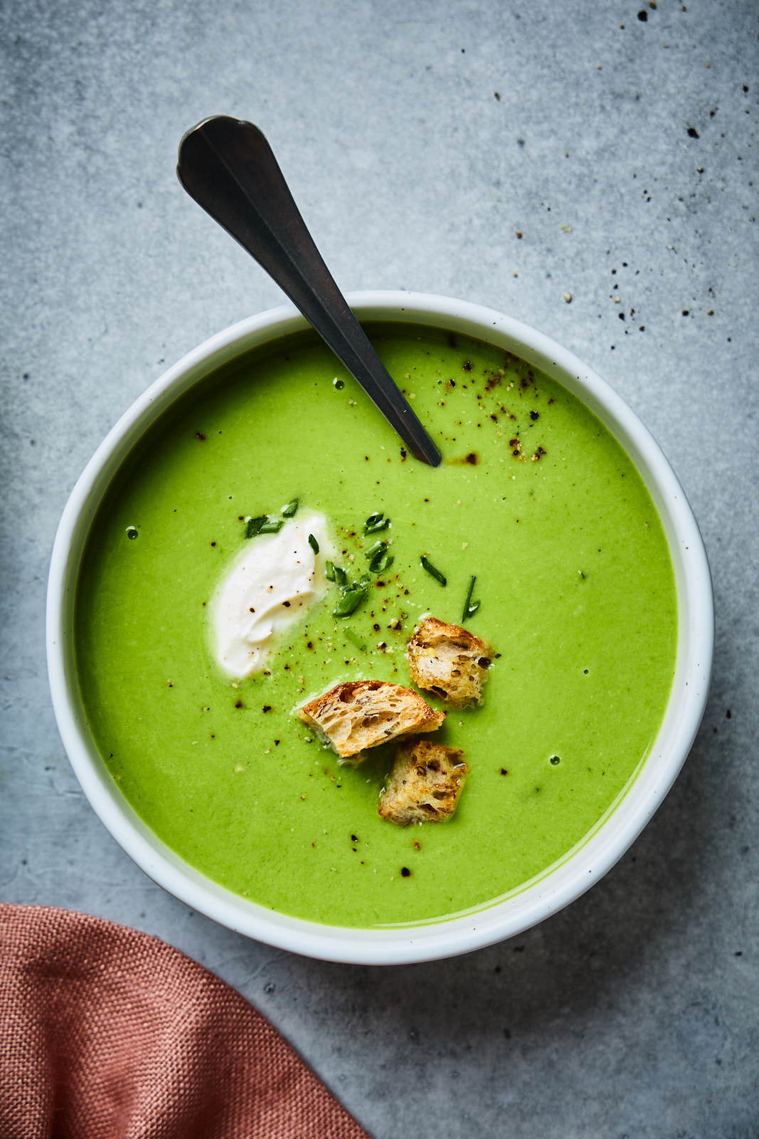A traditional French soup that combines fresh peas and lettuce with leeks or shallots to make a luscious creamy soup that can be enjoyed straight off the oven or chilled. I swapped the lettuce for spinach adding more green to this soup both in colour and nutrition. It’s a delicious way to celebrate spring! Made with fresh or frozen peas, a touch of creme fraiche, and fresh chives,. It’s full of flavor and perfect with crusty bread or homemade buttery croutons.