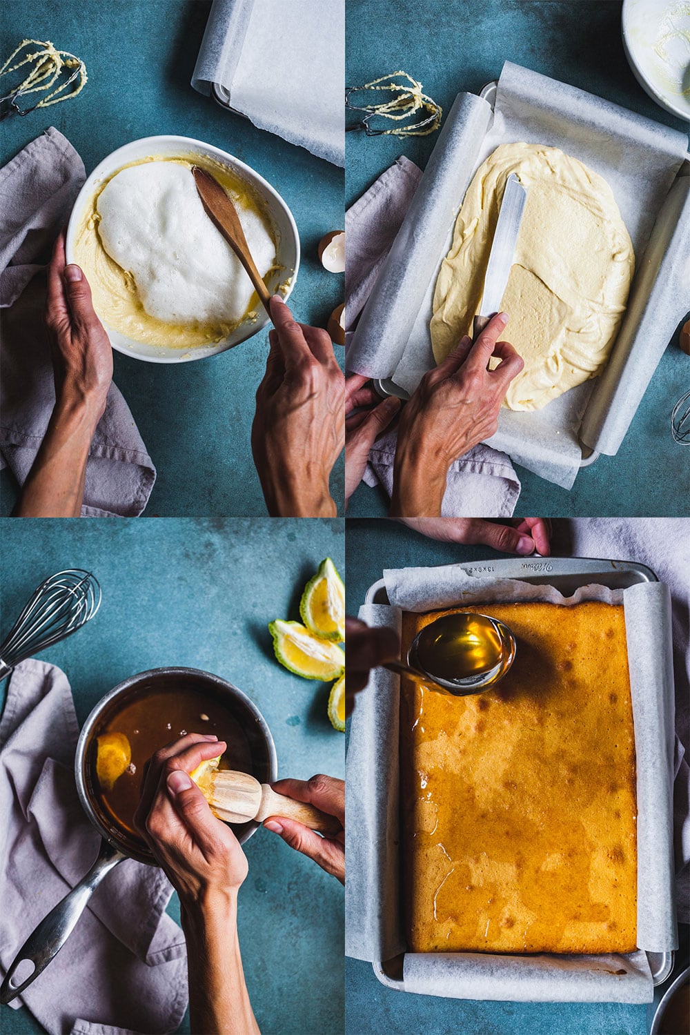 - Immediately after you remove the cake from the oven slice it into diamond shaped pieces or into squares or rectangular pieces and immediately ladle the syrup gently onto the cake evenly. (alternatively pierce it gently all over with a knife edge or a fork or even a skewer then ladle over syrup to allow the cake to absorb the syrup fully.)