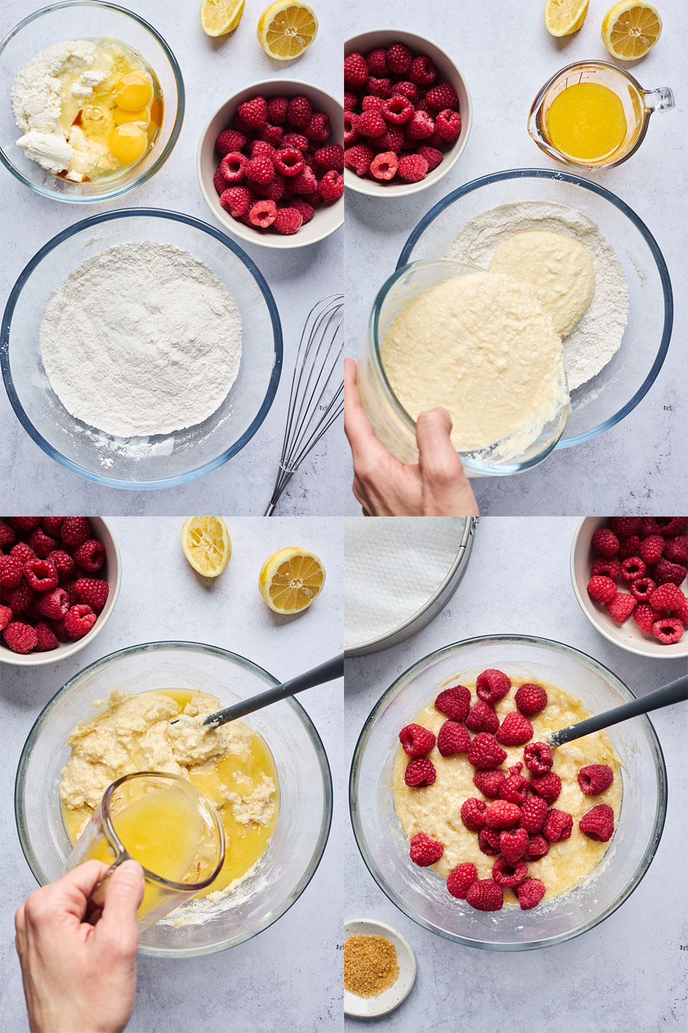 - Drizzle in the butter then fold it into the batter until combined. Gently fold in 1 cup raspberries, taking care not to crush berries.