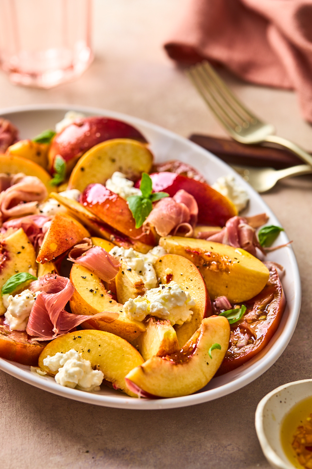 - Prosciutto- love the salty bite of it with the sweet peaches and the tangy tomatoes. For vegetarian just leave it out.
