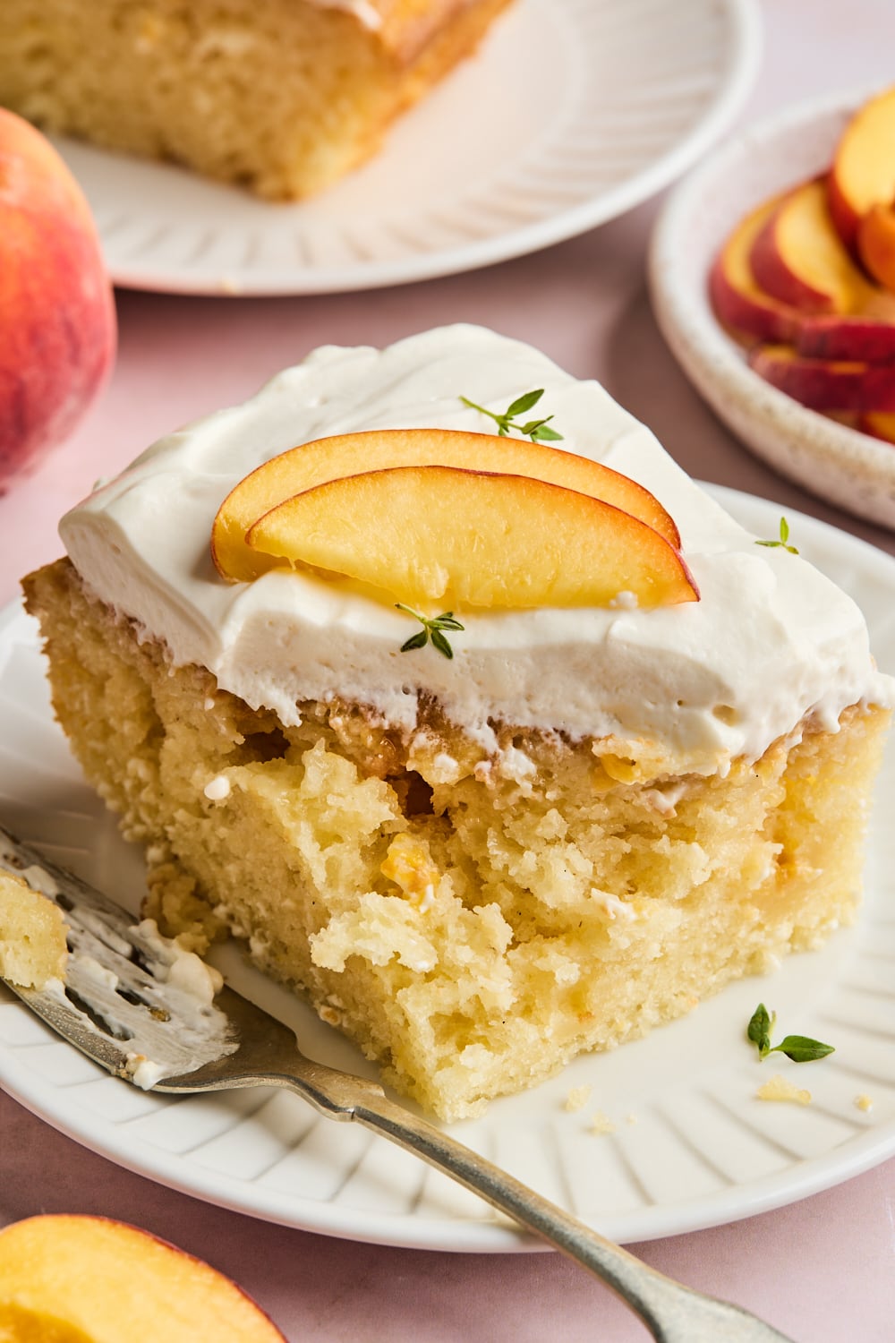This peach cake recipe is made with a vanilla cake base that is lightly spiced, topped and soaked with a peachy puree made with fresh peaches and lightly flavoured with bourbon and finally topped with a light and fluffy cream cheese vanilla whipped topping. I like to garnish with fresh peach slices and some springs of fresh thyme or basil. It is sort of like a poke cake but without the condensed milk or cream (which I think would make it into sort of a tres leches cake) - the puree sort of soaks through some the cake while the rest stays suspended as a peachy layer over the cake. The cake ends up being perfectly moist and squidgey from the peach puree and each bite has a generous amount of creamy goodness to balance the textures and flavors. No box cake mix, gelatin for this one or instant pudding mix - this is a from scratch peach poke cake dessert with so much flavor, substance and flair that you just can’t get from a box!