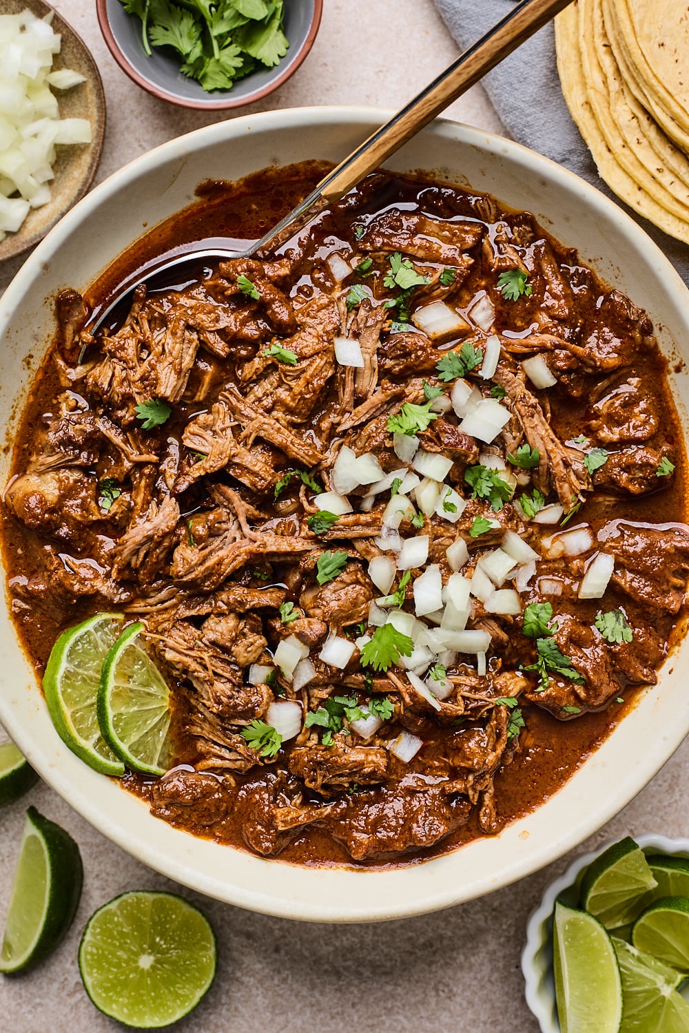 - Serve: As a stew with diced onions, Cilantro and lime wedges or make birria tacos