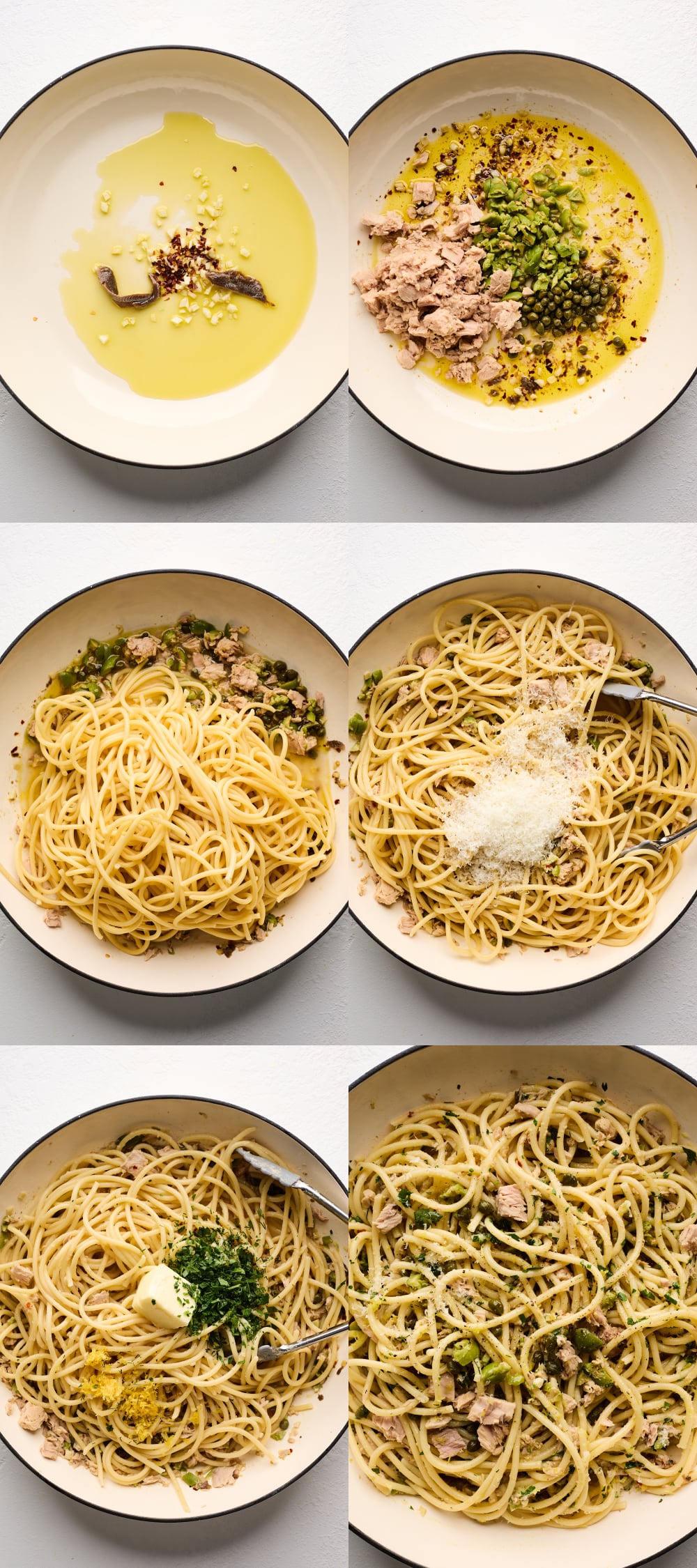 When it comes to the tuna - it’s really up to your taste and what you have in the pantry. I always tend to go for the solid white tuna. I usually have that stocked in my pantry and I prefer it. I like the pieces in the pasta to be a little larger as opposed to it being super flaky. The one I usually use is in water but a nice one with oil is also fine. Feel free to use the oil in the dish too especially if it’s a good quality tuna in oil - if so you may not need to add as much pasta water in the end. If not feel free to drain it.