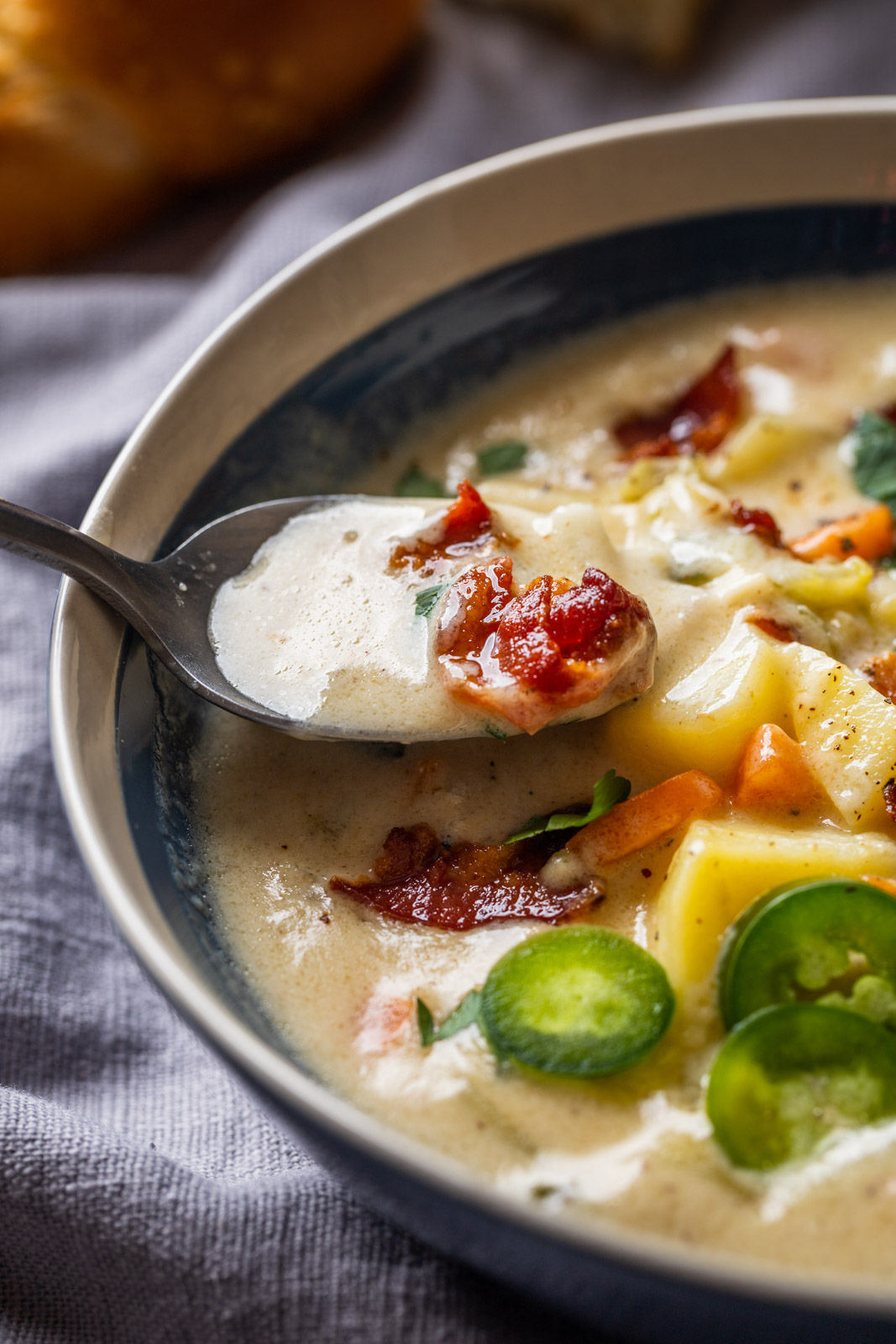 After I posted a recent picture of my classic potato and leek soup on Instagram I did a poll on what other type of potato soup you guys wanted on the blog. It was between this smoky cheddar and jalapeño one and a zuppa Toscana. This one won out by a long shot but I will definitely share the zuppa Toscana one of these days too. They are both deliciously rich except one has more greens than the other. This one is the one lacking the greens and is definitely an indulgent one to be had in moderation but thoroughly enjoyed.