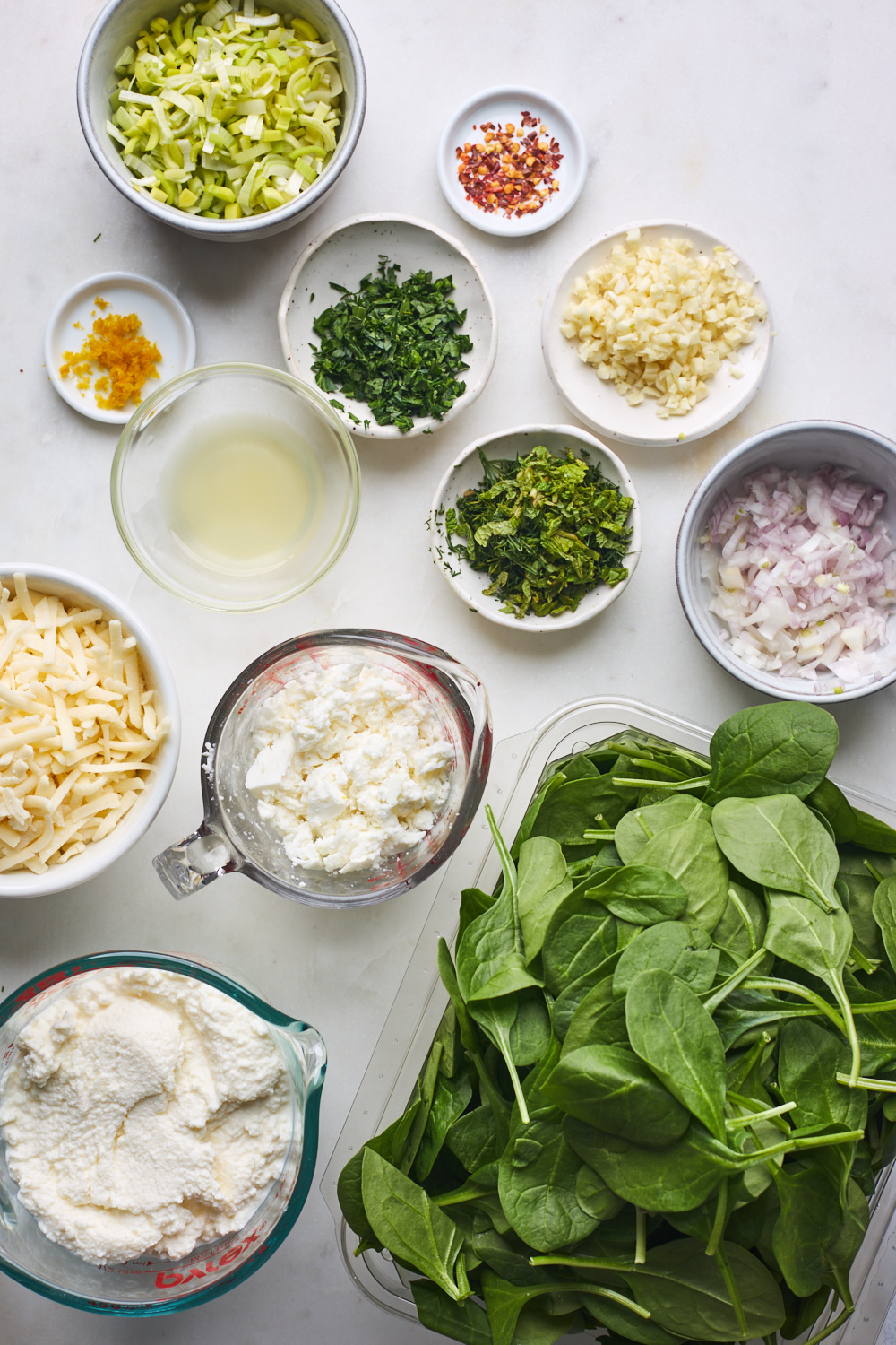 - Using a large non-stick pan, heat olive oil over medium heat. Add leeks, shallots, chili flakes and cook until softened approx 2-3 min, then add the garlic and chopped spinach 1 heaping cup full at time and saute until spinach is just wilted and releases most of its natural juices. Remove pan from heat and set aside